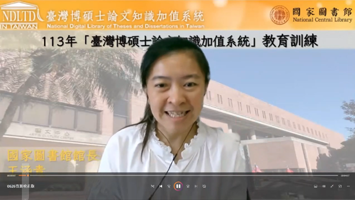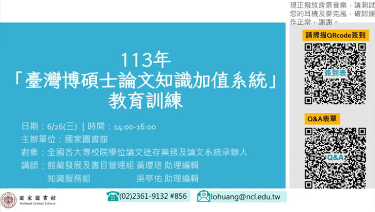 113/6/26(五)下午參加國家圖書館舉辦之113年臺灣博碩士論文知識加值系統教育訓練第4場次線上課程,主講人係國圖館藏發展及書目管理組黃瓔珞及知識服務組吳亭佑助理編輯,課程講題內容大綱:I《大專校院學位論文送存國家圖書館典藏作業要點》宣導說明、II雲端系統論文建檔與管理運用暨認證服務API申請說明、III「學位論文相似檢測輔助系統」介紹說明。