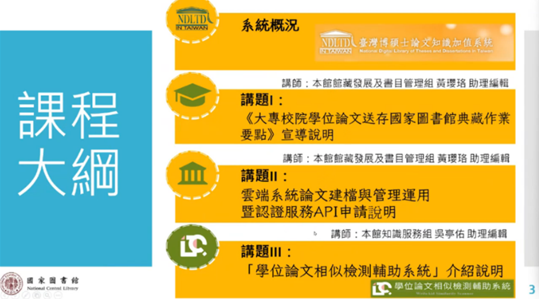 本線上課程由國圖王涵青館長親自錄影開場致詞,續由黃瓔珞及吳亭佑助理編輯依序主講3講題,其中國圖學位論文相似檢測輔助系統係全新系統,為檢測、修正、完善原創之路,立意良善,期可協助維護學術倫理,裨益於臺灣學術倫理之實踐。