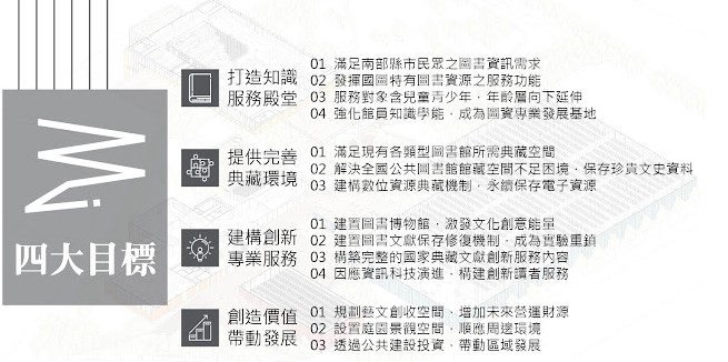 該館由義大利建築師卡爾洛·拉蒂與九典聯合建築師事務所設計,總樓地板面積為51,095平方公尺,未來將提供圖書資訊專業發展基地、圖書館服務創新育成中心、圖書文獻保存及修復實驗中心、本土兒童及青少年文學史料中心等四項服務。緊鄰南館的國家典藏中心也將設有自動典藏庫、聯合典藏館及數位資源保存中心,建置全國規模最大的自動化倉儲系統及倉儲書架,將能豐富臺灣南部的圖書資源,滿足圖書資訊需求。