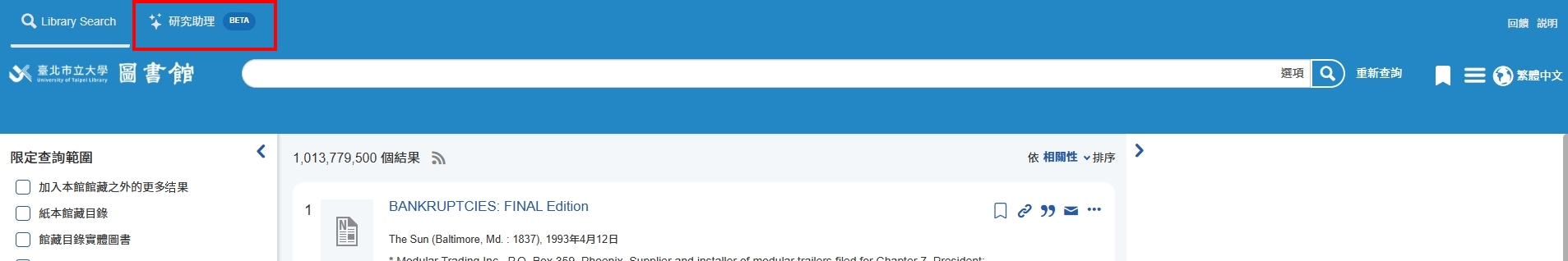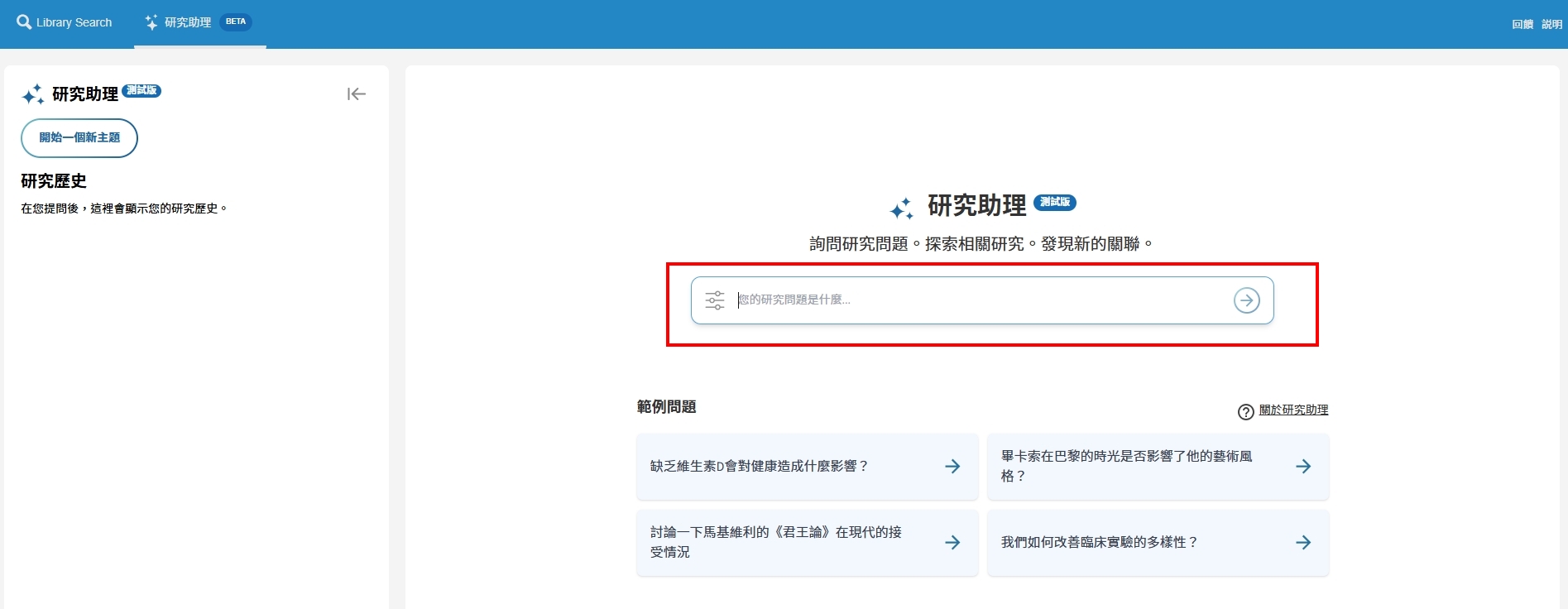 資源探索服務新體驗:圖書館網站新增「AI研究助理」功能撰文:典藏組許世瑩 Summon AI研究助理(Summon Research Assistant)是一個由生成式AI運作的學術資源探索工具,使用者可通過自然語言檢索功能獲取的詳細資訊,查詢到圖書館館藏學術資源。Summon AI研究助理主要特色:可直接以口語化語言輸入研究問題,AI研究助理會擷取最相關資訊來回答問題及提供引文來源,資訊來源係連結圖書館館藏確保資料可靠性。 |