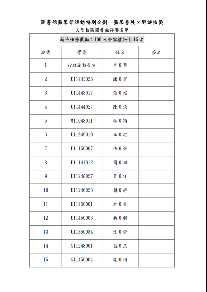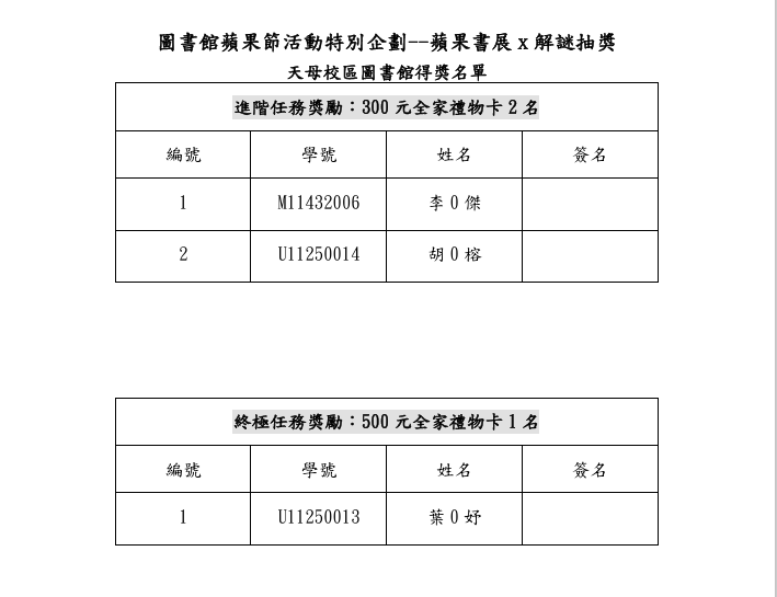 115年3月2日(一)~3月20日(五)辦理之2026蘋果節解謎抽獎活動,獲獎名單公布如下,恭喜得獎同學! 請得獎同學即日起至115年4月30日(四)止,周一至周五8:30~17:00親自至天母校區圖書館櫃檯洽王美玲小姐領取,謝謝。