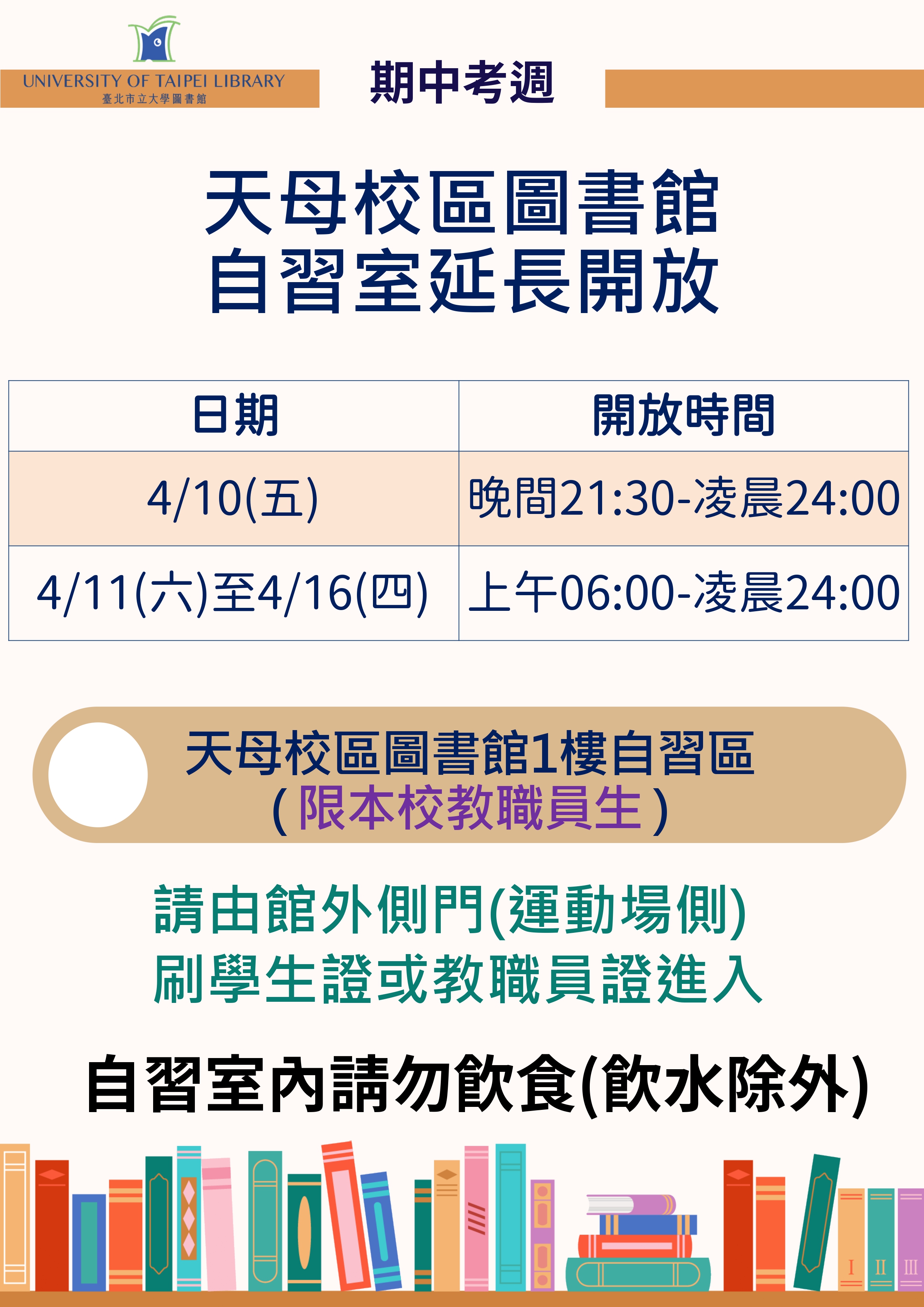【服務訊息】天母校區圖書館配合期中考自習室延長開放
