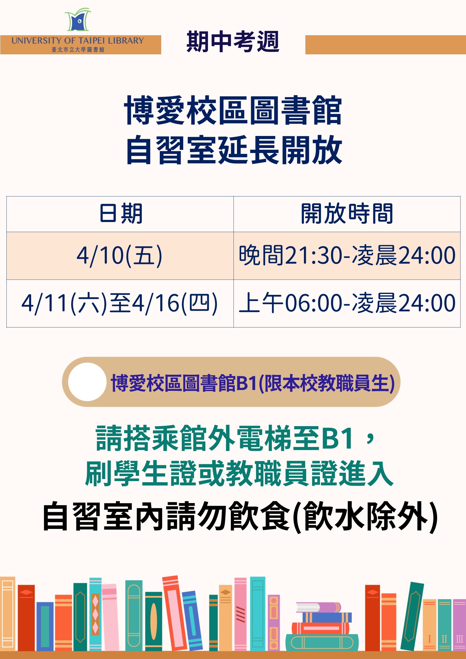 請搭乘館外電梯至地下1樓,刷學生證或教職員證入內。