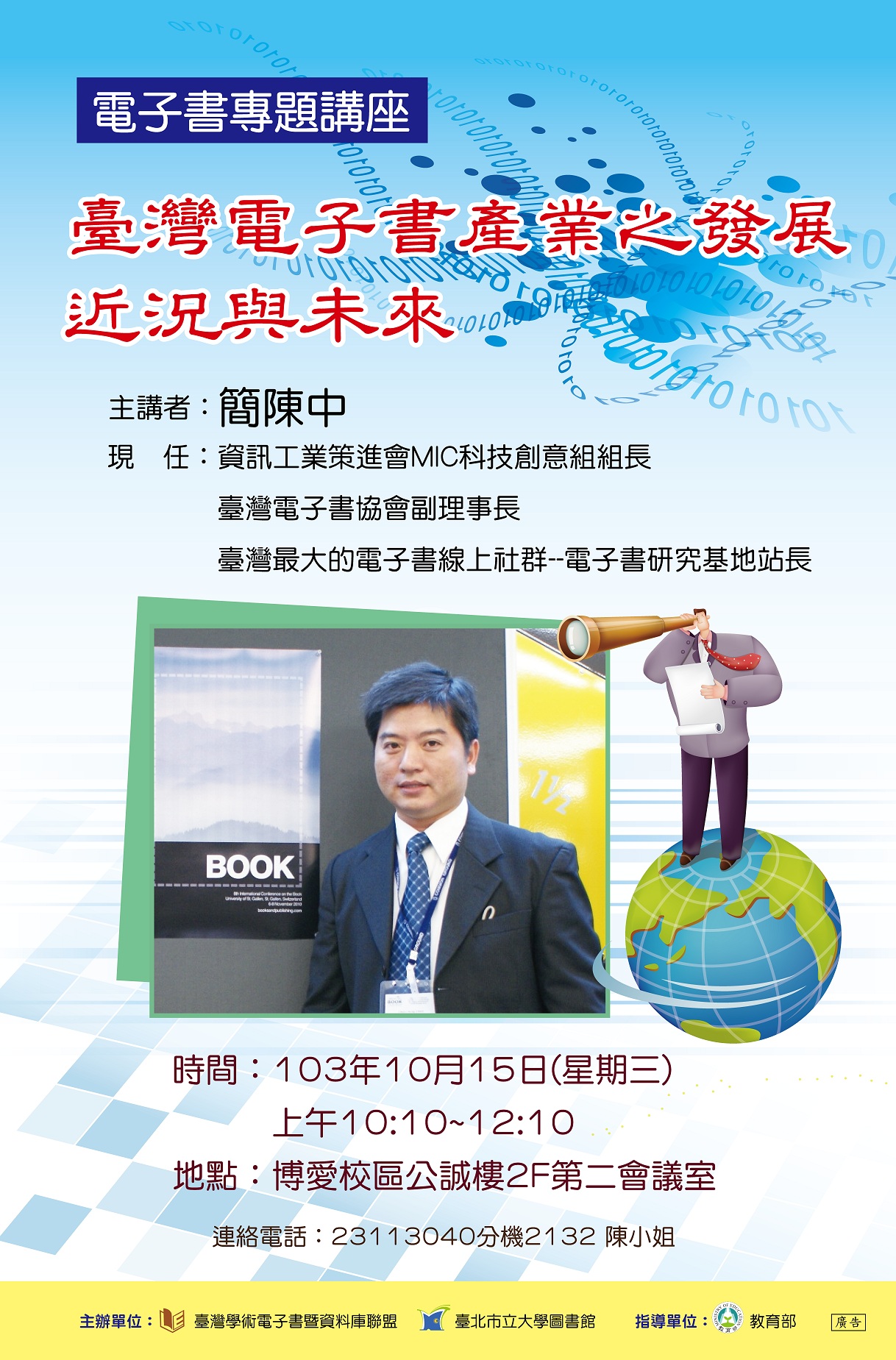 為增進師生對電子書之認識與瞭解,並推廣本館購置之電子書,圖書館特別邀請對電子書及數位出版具有多年研究與實務經驗的簡陳中先生蒞臨本校進行專題演講。